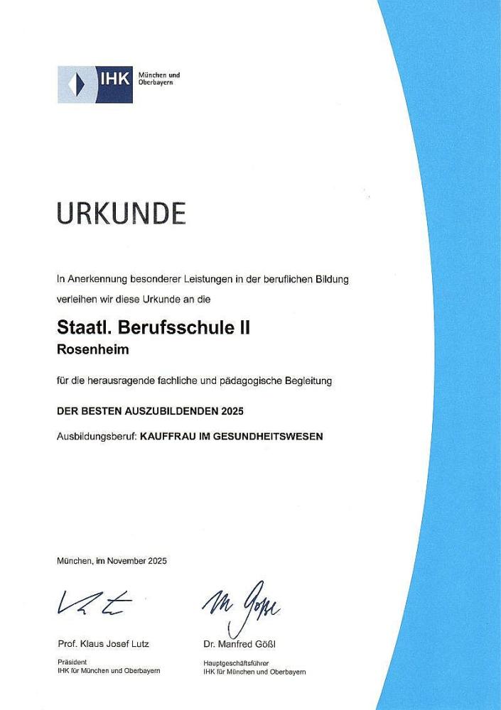 Mit dabei in diesem Jahr waren auch die jeweiligen Ausbilder und ein Vertreter der Berufsschule. Nach einem kleinen Stehempfang und einem Menü im Variete-Theater kam es zum eigentlichen Hauptteil: Alina Lider und Stephanie Sattler, jeweils Kauffrauen im Gesundheitswesen, wurden auf der Bühne von den jeweiligen Vertretern ihrer zuständigen Regionalbezirke Ingolstadt und Garmisch-Partenkirchen empfangen und zu ihren tollen Ergebnissen bei der Abschlussprüfung beglückwünscht. Auch Christian Unterhuber wurde stellvertretend für unsere Berufsschule als verantwortlicher Fachbetreuer für die Kaufleute im Gesundheitswesen mit einer Urkunde bedacht.